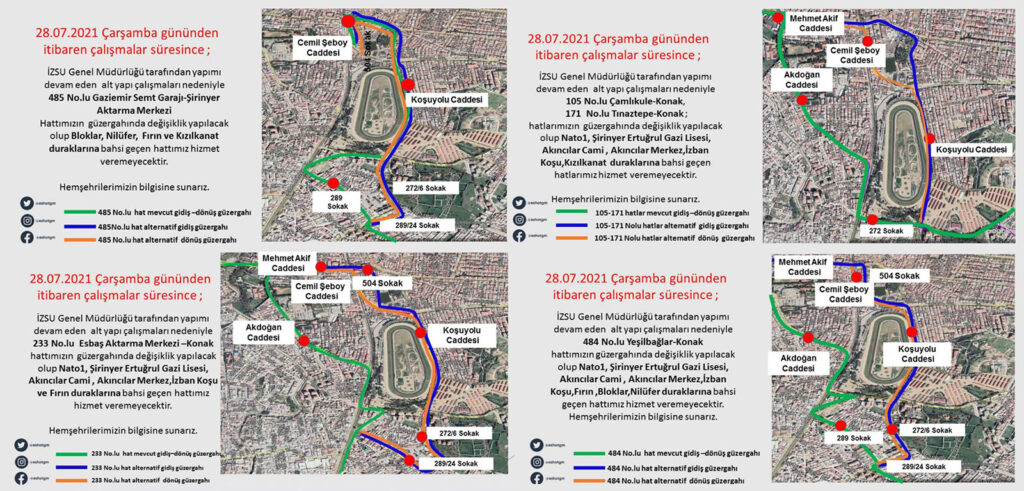 – 105 numaralı Çamlıkule – Konak, 171 numaralı Tınaztepe – Konak, 233 numaralı ESBAŞ Aktarma Merkezi – Konak ve 484 numaralı Yeşilbağlar – Konak arasında hizmet veren otobüslerin dönüş güzergahları mevcut güzergah – Mehmet Akif Caddesi – Cemil Şeboy Caddesi – Koşu Yolu Caddesi – mevcut güzergah olarak düzenlenecek.