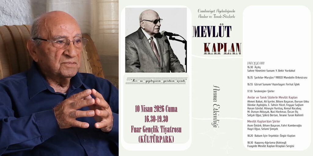 Şubat ayında yaşamını yitiren Köy Enstitüsü mezunu, eğitim ve edebiyat dünyasının ulu çınarı öğretmen, yazar Mevlüt Kaplan için 10 Nisan 2026 Cuma günü bir anma etkinliği düzenlenecek. “Cumhuriyetin Aydınlığında Anılar ve Tanık Sözlerle Mevlüt Kaplan” etkinliği 16.30-19.30 saatleri arasında Kültürpark’ta Fuar Gençlik Tiyatrosu’nda izlenebilecek. Sunumunu yazar Yunus Bekir Yurdakul’un üstlendiği etkinlikte Yeni Kuşak Köy Enstitüleri Derneği Mandolin Orkestrası da bir konser verecek. Mevlüt Kaplan, etkinlikte oğlu Özgür Kaplan’ın yanı sıra dostlarının şiirleyle, anlatılarıyla anılacak.