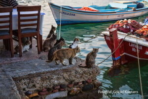 Hemen her sokakta, her evin ve her mekanın önünde mutlaka bir kedi vardır. Ya pencerede bekleşir ya da kapı eşiğinin önünde kendisine uzatılacak bir lokmayı gözler bu sokak canları. Sarman, tekir, melez yavrular dolaşır durur ayaklarınıza Ayvalık sokaklarında. Hiçbiri aç kalmaz, sahipsiz sandığınız kedilerin mutlaka iki kapısı vardır; birinden ses çıkmazsa ikincisinde mutlaka bilir karnının doyurulacağını.