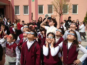 Milli Eğitim Vakfı (MEV) Özel İzmir İlköğretim Okulu öğrencileri, güneş tutulması olayını fırsat eğitimine çevirdi. İlköğretim birinci kademede okuyan bin öğrenci okul bahçesini doldurdu. Güneşin tam tutulma evresinin yaşandığı 13.50 ile 14.00 arasında özel gözlükleriyle tutulmayı izleyen öğrenciler, bu yüzyılın ilk tam Güneş tutulmasına şahit oldu. Güneş tutulması sırasında güneş, ay ve dünya’nın konumlarını sınıf içinde canlandıran öğrenciler daha sonra da tutulma anını okul bahçesinde öğretmenleri ile birlikte izlediler. Bir daha 2060 yılında gerçekleşecek bu doğa olayını öğrencileriyle birlikte izleyen Okul Müdürü Halil Çıldır, eğitimde bu tür fırsatların değerlendirilmesinin önemine dikkat çekti.