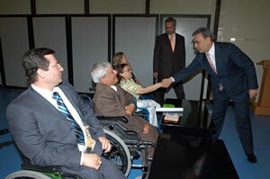 İzmir Büyükşehir Belediye Başkanı Aziz Kocaoğlu, İzmir’de faaliyet gösteren engelli dernek ve vakıflarının başkanları ile üyelerini kabul etti. 10-16 Mayıs 2006 tarihleri arasında düzenlenen “Engelliler Haftası” etkinlikleri kapsamında gerçekleştirilen ziyarette, Başkan Kocaoğlu, engelli vatandaşlara yönelik projeleri anlattı. İzmir Büyükşehir Belediyesi Çetin Emeç Toplantı Salonu’nda gerçekleştirilen toplantıda Genel Sekreter Yardımcısı Serpil Güngör ile Kültürel ve Sosyal Hizmetler Daire Başkanı Selma Nalbantoğlu da hazır bulundu. Başkan Aziz Kocaoğlu, İnciraltı’ndaki Engelliler Merkezi’nin kapatılacağına ilişkin spekülasyonlar yapıldığına dikkat çekerek, merkezin kapatılmasının söz konusu olmadığını söyledi. Kocaoğlu, “Biz, engelli vatandaşlarımıza hizmet sunacak daha merkezi bir yerde hizmet binası yapmayı düşünüyoruz. Engelli vatandaşlarımız için özel tasarımlı iki minibüs alacağız. Engelli hemşehrilerimiz için özel tasarlanmış iki minibüs alacağız. Bir de özel randevu sistemi kuracağız. Vatandaşlarımız telefonla randevu alacaklar ve resmi dairelerdeki işlerini görmek üzere minibüsle refakatçıları ile birlikte evlerinden alınıp istedikleri kuruma götürülecekler. Ayrıca, yine aynı sistemle İnciraltı Engelli Merkezi’ne götürülüp yine evlerine bırakılacaklar” dedi. Buca’da “Sosyal Destek Kampusü” kurmayı planladıklarını da anlatan Başkan Kocaoğlu, “60-70 bin metrekarelik bir alanda; içinde kadın sığınma evi, barınma ihtiyacı olan kentlilerin barınabileceği bir merkez, psikolojik danışma merkezi, sportif faaliyetlerin yapılabileceği birimlerin yer alacağı bir kampus kurmayı hedefliyoruz” diye konuştu.