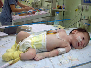 Kemalpaşalı 18 günlük Yaşar bebeğin doğuştan her iki böbreğinde görülen şişlik Ege Üniversitesi Tıp Fakültesi Çocuk Cerrahisi Anabilim Dalı Çocuk Ürolojisi Bilim Dalı’nda gerçekleştirilen bir operasyonla indirilerek biriken idrar dışarı çıkarıldı. Henüz anne karnındayken ultrasonla böbreklerindeki rahatsızlık belirlenen minik bebeğe iki günlükken yapılan bir işlemle kateter takılarak böbreklerindeki idrar dışarı alındı, bu sayede oluşan şişlik ortadan kaldırıldı. E. Ü. Tıp Fakültesi Çocuk Ürolojisi Bilim Dalı Başkanı Prof. Dr. İbrahim Ulman, bebekte “Hidronefroz”un böbrek ile idrar kanalına geçiş olan noktada tıkanıklığa yol açan bir hastalık olduğunu belirtti. Prof. Dr. Ulman, “Doğumdan önce henüz anne karnındayken bu rahatsızlığı tespit etmek mümkün. Doğumdan sonra belirti vermediği fark edilmiyor. Hastalık tanısı konduğunda ise çok geç kalınmış oluyor. Eğer zamanında müdahale edilmezse böbrekler fonksiyonunu kaybedebiliyor” dedi. Her 500 gebeden birinde “Hidronefroz” adı verilen bu rahatsızlığın görüldüğünü açıklayan Prof. Dr. Ulman, “Ne yazık ki bu hastaların çoğu gözden kaçırılıyor. Bu konuda ailelerin de bilinçli hareket etmesi ve gebeliğin 16 – a18. haftaları arasında mutlaka ayrıntılı bir ultrason yaptırması gerekir. Bu ultrasonda bebekteki doğuştan gelen tüm sakatlıklar araştırılabilir” diye konuştu. (Seçil Utma / Ege Ajans)