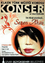 İzmir Büyükşehir Belediyesi Klasik Türk Müziği Korosu, sevilen sanatçı Sezen Aksuyu ağırlayacak. 5 Temmuz Perşembe günü saat 21.00de Kültürpark Açıkhava Tiyatrosunda gerçekleştirilecek olan konserin ilk bölümünde koronun sunacağı program yer alacak. İkinci bölümde ise Türk Sanat Müziği yorumlarıyla konuk sanatçı Sezen Aksu sahne alacak. İzmir Büyükşehir Belediyesinin İzmirlilere armağanı olan konsere giriş numaralı davetiyelerle olacak.