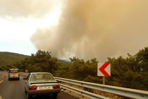 Sabuncubeli bölgesindeki ormanlık alanda yangın çıktı. Saat 10.30 sıralarında Karakoca ve Beşyol köyleri arasındaki bölgede başlayan yangın rüzgarın etkisiyle kısa sürede geniş bir alana yayıldı. Yangın orman köylerini tehdit etmeye başladı. Bazı köylerdeki yurttaşlar önlem olarak evlerinden ve bölgeden uzaklaştırıldı. Son dört gün içindeki beşinci yangını söndürme çalışmalarına Orman Bölge Müdürlüğü ve bağlı işletme müdürlükleri ekiplerinin yanı sıra uçak ve helikopterler katılıyor. Askeri birlikler ve yurttaşların da katıldığı çalışmalarla yangının denetim altına alınmasına çalışılıyor. Yaklaşık 350 hektar alanın zarar gördüğü orman yangınında yükselen dumanlar İzmir kent merkezine ulaştı, havada güneş tutulmasını andıran görüntüler yarattı, gökyüzünden kül yağdı.