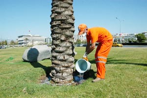 İzmir’in simgelerinden palmiye ve hurma ağaçları, başta İsrail olmak üzere tüm Akdeniz ülkelerini tehdit eden Palmiye Kırmızı Böceği’ne karşı koruma altına alındı. İzmir Büyükşehir Belediyesi Tarım, Park ve Bahçeler Daire Başkanlığı’na bağlı ekipler, palmiye ağaçlarının gövdesine ve sürgün diplerine yerleştikten sonra bitkinin gövdesini ve büyüme filizlerini yiyerek ağacın ölümüne neden olan zararlıya karşı ilaçlama çalışması başlattı. Tehlikenin farkına vararak ilaç alımı yapan Büyükşehir Belediyesi, 2003 yılında rekreasyon alanlarına dikilmek üzere Mısır’dan ithal edilerek kente getirilen hurma ve palmiye ağaçlarını ilaçlamaya başladı. Uzmanlar denetiminde yürütülen ilaçlama çalışmaları kapsamında ekipler, ilk etapta Konak Meydanı, Mustafa Kemal Sahil Bulvarı ve Güzelbahçe sahilindeki ağaçları ilaçladı. Kent genelindeki 5 bin 805’i palmiye, 7 bin 781’i de hurma olmak üzere toplam 13 bin 586 ağacın ilaçlama işleminin birkaç gün içinde tamamlanacağı belirtildi.