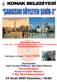 İzmir’i Sevenler Platformu – Ege Kültür Platformu’nca “Şarkısını Söyleyen Şehir” konulu özel sunumun ikincisi düzenlendi. İzmir araştırmacısı, belgecisi, sanatçı Yaşar Ürük, yüzyıllarca “İzmir için” ya da “İzmir’de” veya “İzmirliler tarafından” bestelenmiş şarkıların öykülerini “İzmir görüntüleri” eşliğinde sunacak. Kent -Yaşam yazarı Yaşar Ürük’ün hazırlayıp sunacağı etkinlik 21 Ocak 2008 Pazartesi günü saat 18.30’da, Kıbrıs Şehitleri Caddesi’ndeki Konak Belediyesi Alsancak Kültür Merkezi’nin 7. katındaki Benal Nevzat Salonu’nda gerçekleştirilecek. Ürük, bu sunumunda İzmir ile ilgili “Çocuk Müziği, Pop, Jazz, Geleneksel Türk Müziği, Türk Halk Müziği, Rembetiko, Ladino, Roman, Kanto, Bando, Senfonik Müzik ve İonya” müziklerinden 17 eseri anlatacak.