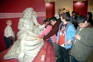 Konak Belediyesi ve İzmir Turist Rehberleri Odası’nın ortaklaşa düzenlediği etkinlikte, Aşık Veysel Görme Engelliler İlköğretim Okulu öğrencileri ilk kez müze gezme fırsatı buldu. 13 görme engelli öğrenci dokunarak müzeyi tanımaya çalıştı. Minikler, Atatürk Müzesi, Ahmet Piriştina Kent Arşivi Müzesi ve ardından İzmir Tarih Sanat Müzesi’ni gezdi. Daha önce müzeleri kitaplardan öğrendiklerini söyleyen beşinci sınıf öğrencileri, bu fırsatı tanıdıkları için Konak Belediye Başkanı Muzaffer Tunçağ ve İzmir Turist Rehberleri Odası Başkanı Yalçın Ulukaya’ya teşekkür etti. Tunçağ, “Düzenlediğimiz müze gezisiyle çocuklar kendi dünyalarından dışa açılıp kültür ve uygarlığı dokunarak bilinçlerine aktarmış olacaklar. İzmirli olmanın kimliğini daha iyi anlayacaklar” dedi. Müze gezilerine katılan miniklere katılım belgesi verdiklerini anlatan Tunçağ belgelerinin de Braille Alfabesi’yle yazılacağını belirterek çocuklara Atatürk şiirlerini içeren CD’yi armağan etti. Aşık Veysel Görme Engelliler İlköğretim Okulu Müdürü İsmail Çelik de görme engelli çocukların müzelerde nelerin sergilendiği hakkında bilgi sahibi olduklarını söyledi Çelik, “Düzenlenen müze gezisiyle heykelleri inceleme fırsatı buldular. Daha önceden kille heykellerin maketleri yapıldı. Model olarak yaptıklarını şimdi dokunarak öğreniyorlar. Müze gezisiyle görme engelli çocuklar tarihi eser nedir, ne anlama gelir sorularına yanıt bulduklar” dedi.
