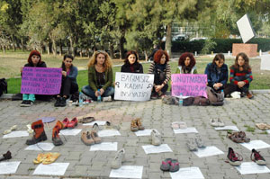 Ege Üniversitesi, Kadın Yönelik Şiddetle Mücadele Günü’nde ilginç bir eyleme sahne oldu. İzmir Bağımsız Kadın İnsiyatifi, öğrencilerin en yoğun olduğu saatlerde ayakkabılı eylem yaptı. Bir grup kadın, ayakkabılarının yanına, gazetelerin üçüncü sayfalarından alıntılanmış, kadına yönelik hem psikolojik hem fiziksel şiddet içeren yazılar koyarak sessiz eylem gerçekleştirdi. Eylemde ayakkabıların kullanım nedeni, geleneklerimize göre ölen kişinin ayakkabılarının kapının önüne konulması ve her ayakkabının bir kadını simgelemesi olarak açıklandı. Dünyanın yarısının diğer bir yarısı tarafından şiddete maruz kaldığını düşündüklerini belirten topluluk üyeleri, Bütün kadınların bizimle beraber bu eylemi yapmasını istiyoruz dedi. (Ege Ajans)