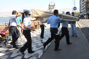İzmir Büyükşehir Belediyesi Zabıta Daire Başkanlığı ekiplerinin polisle işbirliği sonucu Kordonda görüntü kirliliği yaratan şemsiyeler toplandı. Zabıta ekipleri, Atatürk Caddesinin Konak Pier ile Pasaport İskelesi arasında kalan bölümünde kaldırımlardaki tüm şemsiyeleri topladı. 30 zabıta ve 20 polisin katıldığı uygulama, deniz tarafındaki kaldırımlarda bulunan 50ye yakın şemsiyenin zabıtalar tarafından kamyonetlere yüklenerek götürülmesiyle son buldu. İzmir Büyükşehir Belediyesi Zabıta Dairesi Başkanlığı yetkilileri, kentin vitrini niteliğindeki Kordonda hem görüntü kirliliği yaratan hem de kamuya ait alanları işgal eden uygulamalara izin verilmeyeceğini belirterek, söz konusu ihlalleri gerçekleştiren esnaf hakkında Kabahatler Kanunu uyarınca yaptırım uygulanacağı dile getirildi.