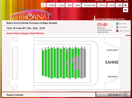 İzmir Büyükşehir Belediyesi, ücretli düzenlenen kültür sanat etkinliklerine bilet almak isteyenler için “elektronik bilet” uygulaması başlattı. İzmir Büyükşehir Belediyesinin www.izmir.bel.tr alan adlı internet sitesinin ana sayfasında yer alan “Kültür – Sanat” başlıklı bölüm tıklandığından açılan sayfa üzerinden üyelik işlemlerini gerçekleştiren sanatseverler, ücretli kültür – sanat etkinlikleri için biletlerini evlerinden ya da işyerlerinden alabilecek. Elektronik bilet (e-bilet) almak isteyenler, Kültür – Sanat sayfasının sağ yanındaki “Üye girişi” bölümüne girerek “Üye olmak istiyorum” alt başlığını tıkladıklarında üyelik işlemlerini gerçekleştirebiliyor. Sisteme üyelik ve bilet satın almak için gereken kişisel bilgilerin şifreli veri iletim yöntemiyle korunduğu, bilet ücretlerinin de güvenli biçimde alınabildiği belirtildi. Yeni uygulama, izleyiciye dilediği koltuğu seçme olanağı sağlarken, satın alınmış olan “e-bilet”ler istenirse başka bir izleyiciye de aktarılabiliyor. e-bilet satışı uygulaması, önümüzdeki günlerde İzmir Büyükşehir Belediyesinin yenilenen mobil internet sitesi ile metro istasyonlarında hizmet veren kiosklarda da hizmete sunulacak.
