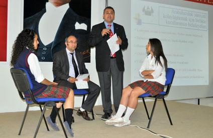 Gaziemir, Menderes ve Karabağlar ilçelerindeki ilköğretim ve liselerde görev yapan 120 psikolojik danışma ve rehberlik öğretmeni, Prof. Dr. Abbas Türnüklünün halen 18 lisede uygulanan ve akranlar arası çatışmayı yüzde 90a varan oranda engelleyen sistemi hakkında bilgi aldı. Öğretmenlere Çatışma çözme, müzakere ve akran arabuluculuğu eğitim programını tanıtan ve uygulama yaptıran Prof. Dr. Türnüklü, görüşme ve diyalog, uzlaşı ve barış kültürü ile şiddeti engellemeyi hedefleyen programın uygulandığı eğitim kurumları, öğrenciler ve ailelerinin yaşamına getirdiği olumlu gelişmeleri aktardı.