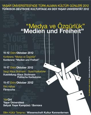 İzmir Goethe-Institut ve Yaşar Üniversitesi işbirliği, İzmir Gazeteciler Cemiyeti ve İzmir Barosunun katkısıyla Medya ve Özgürlük konulu konferans düzenlenecek. Türk – Alman Kültür Haftası etkinlikleri çerçevesinde düzenlenecek konferans, 11 -12 Ekim 2012 günlerinde, 09:30 18:30 saatleri arasında Yaşar Üniversitesi Selçuk Yaşar Kampüsü’nde gerçekleştirilecek. Konferansın ilk günü, oturumların bitiminden hemen sonra “Klaus Stuttmann Siyasi Karikatürler” konulu sergi açılacak.