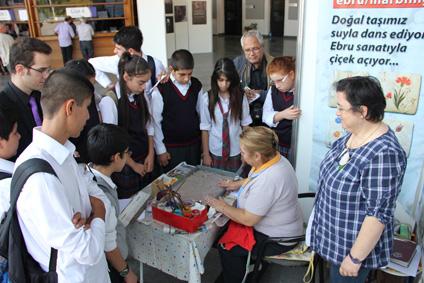 Basmane semtindeki Şehit Fethi Bey İlköğretim Okulu ile Bayraklı’daki Ali Osman Konakçı Kız Teknik ve Meslek Lisesi Grafik ve Fotoğraf Bölümü öğrencileri de Estetik Ebru sergisini gezdi. Estetik Ebru projesinin yöneticisi Saadet Erciyas ile ebru sanatçısı Kadriye Sayınbatur, öğrencilere geleneksel ebru sanatını anlattı, ebrunun yapılışını uygulamalı olarak gösterdi.