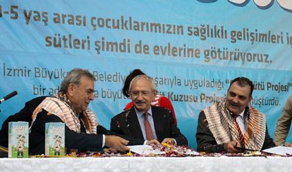 Tire Süt Kooperatifi Başkanı Mahmut Eskiyörük de kooperaiflerin bugün vahşi kapitalizme karşı ulusal duruşun temeli olduklarını belirttti. Tireli süt üreticileri adına konuşan Alime Aktaş da, İzmir Büyükşehir Belediye Başkanı Aziz Kocaoğluna teşekkülerini dile getirdi. Tören sırasında süt üreticileri Prenses adını verdikleri 4 aylık buzağıyı Kemal Kılıçdaroğluna hediye etti.