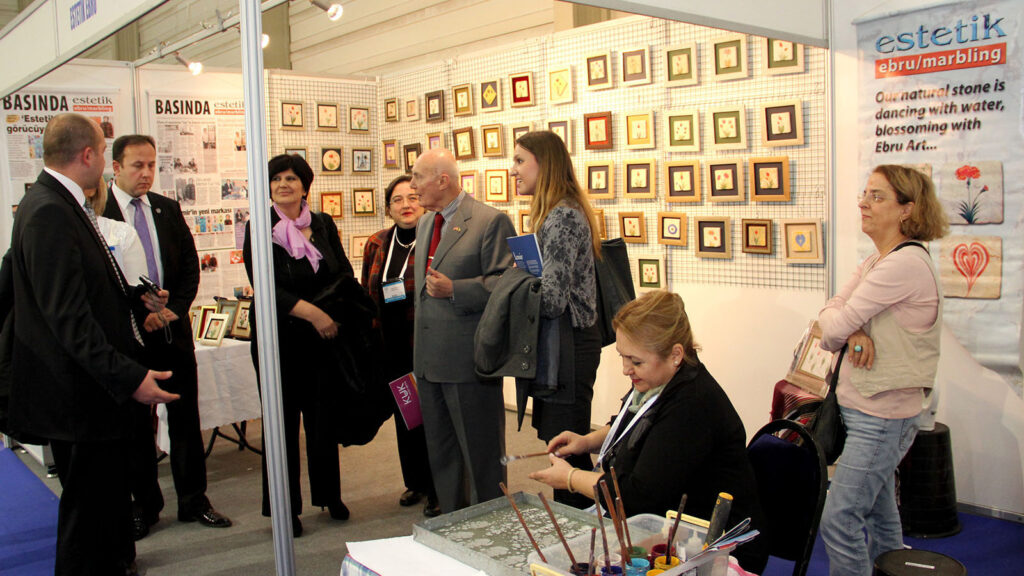 Estetik Ebru’nun Uluslararası Fuar Alanı 4 No’lu Hol’deki standında ebru sanatı uygulanmış doğaltaşlarla oluşturulan kültürel hediyelik ürünler sergilendi. Kadın ebru sanatçılarının elinden çıkan, her biri sanat eseri niteliğindeki eşsiz kültürel ürünler, özellikle yabancı turizmcilerden büyük ilgi gördü. Estetik Ebru sanatçılarından Kadiye Sayınbatur, fuar alanındaki standda ebru gösterisi yaptı.
