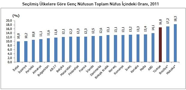 Seçilmiş ülkelere göre genç nüfusun toplam nüfus içindeki oranı incelendiğinde, 2011 yılında 15-24 yaş grubundaki genç nüfus oranının yüksek olduğu ülkelerden birinin Türkiye (yüzde 16,8) olduğu görülüyor.