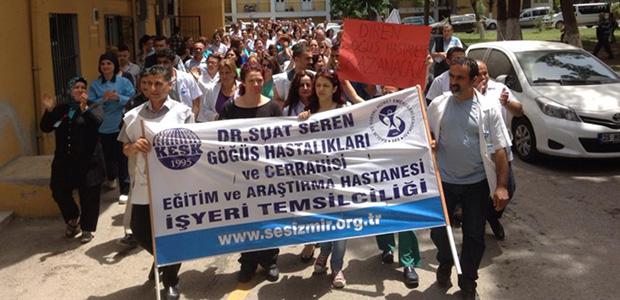 Tepecik Eğitim ve Araştırma Hastanesi ile Dr. Suat Seren Göğüs Hastalıkları ve Cerrahisi Eğitim ve Araştırma Hastanesinin birleştirilme kararının ardından sağlık çalışanlarının eylemleri sürüyor. Hastane çalışanları, kampus içinde bir protesto yürüyüşü ve forum düzenledi.