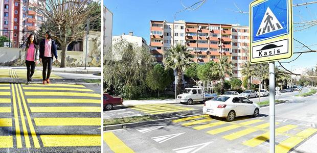 İzmir Büyükşehir Belediyesi “Önce Yaya Güvenliği Projesi” kapsamında kentteki 110 ayrı noktada yükseltilmiş “yeni nesil yaya geçitleri” uygulamasına başladı. Engelli vatandaşlar ile birlikte tüm yayaların güvenli bir şekilde karşıdan karşıya geçmesini hedefleyen proje hızla yaygınlaştırılacak. Öncelikle okul önleri ve yaya yoğunluğunun fazla olduğu cadde ve bulvarlardaki “yükseltilmiş geçitler” özel boyalarla çizilerek görünürlüğünün artırılacak. Engelli vatandaşlar için kılavuz çizgilere yer verilen geçitlerdeki yükselti sayesinde sürücülerin öngörülen hıza inmesi sağlanacak. Yine engelli ve yaşlı vatandaşların erişim kolaylığı göz önünde bulundurularak yol ve kaldırımlar aynı seviyeye getirilecek. “Önce Yaya Güvenliği Projesi” çerçevesinde sürücüler, yol yüzeyine çizilen yavaşlama, uyarı, ok ibareleri ve ofset tarama çizgileri ile uyarılacak.