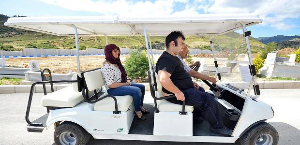 Büyükşehir Belediyesi, Doğançay Mezarlığı’na araçsız gelen vatandaşların kabir ziyaretlerini rahatlıkla yapabilmeleri için akülü iki arabayla hizmet vermeye devam ediyor. İdari bina önünde bulunan ve görevli personel tarafından saat 08.30 ile 17.30 arasında gelen ziyaretçileri taşıyan akülü araçlar, özellikle yürüme zorluğu çekenler için büyük kolaylık sağlıyor.