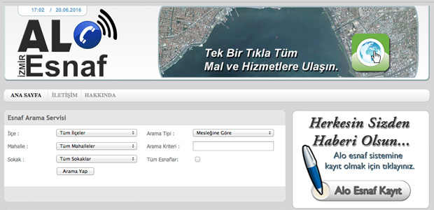 İzmir Esnaf ve Sanatkarlar Odaları Birliği’nin “Alo Esnaf İzmir” balıklı web sitesi aracılığıyla esnaf sanatkarların ürettiği mal ve hizmetleri İzmirliler’e sunuyor. İzmir Kalkınma Ajansı’nın desteğiyle yaşama geçirilen “Alo Esnaf İzmir” projesi kapsamında, 131 meslek odasının tüm üyeleri hem birbirleriyle hem de vatandaşla internet ortamında, web sitesi aracılığıyla bağlantı kurabiliyor. İzmir kent merkezinde ve ilçelerde, İESOB’ye bağlı 350 bin işyerinin telefonu, unvanı, adresi, hangi ürünü sattığı, hangi hizmeti verdiği, POS cihazı kullanımı, kargo ile satış yapıp yapmadığı gibi ayrıntılı bilgiler Alo Esnaf projesine işlendi. Bilgisayar, cep telefonu veya tablet aracılığıyla internete bağlanan herkes www.aloesnafizmir.com.tr alan adlı web sitesi üzerinden “Alo Esnaf İzmir”e ulaşabiliyor. Vatandaşları bu sistem sayesinde günün her saatinde, hizmet almak istediği alanlarda, bulundukları yere en yakın esnaf işletmesini görebiliyor.