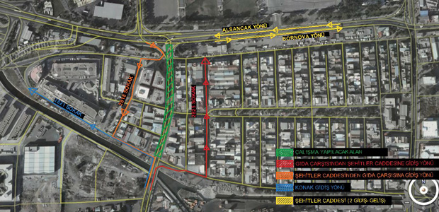 Gıda Çarşısı’ndan Stadyum yönüne gidişler 2825 Sokak, Stadyum’dan Gıda Çarşısı yönüne gidişler 2818 Sokak, Gıda Çarşısı’ndan Konak yönüne gidişler ise 2821 Sokak üzerinden sağlanacak. 2823 Sokak üzerindeki araç trafiği ise çalışmalar süresince Şehitler Caddesi üzerinde iki gidiş – iki geliş olarak düzenlenecek.