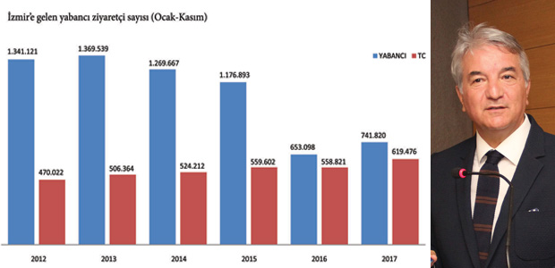 “2018 yılında hava yoluyla 2015 yılı rakamlarına yaklaşan sayıda, 900 bin civarında ziyaretçi gelmesini bekliyoruz. Ne yazık ki İzmir’in havayolunda gösterdiği bu başarıyı kruvaziyer turizminde görmek zor. Kruvaziyerde 2011’de 477 bin turist alan İzmir’e geçen yıl 7 bin dolayında kruvaziyer turist geldi. 2018 yılı aradaki 470 bin düşüşün telafi edileceği yıl değil. Amerika ile vize sorunun çözümü bu alanda geriyi dönüşü hızlandırıcaktır. Özellikle güvenli ülke imajı yerleştikçe ve 15 Temmuz hain saldırısının bıraktığı negatif algı değiştikçe, en iyimser tahminle 2019 veya 2020 yılında kruvaziyer turizmde canlanma başlar. Bu yıllarda en çok 200 – 300 bin civarında kruvaziyer turist alırız. Zira kruvaziyer turizm bu krizden en çok ve en çabuk etkilenen, ama geriye dönüşü en geç olan turizm çeşitlerinden biridir.”