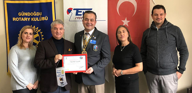 Gündoğdu Rotary Kulübü 2017-2018 Dönem Başkanı Ercan Çelikkaya, kulüp yöneticileri Oya Ertuğrul, Selman Uysal ve Sevda Çelikkaya ile birlikte Ege Turistik İşletmeler ve Konaklamalar Birliği’ni ziyaret etti. TÜROFED Başkan Yardımcısı ve ETİK Başkanı Mehmet İşler’le bir araya gelen Çelikkaya ve beraberindekiler, kent turizmini değerlendirdi, görüş alışverişinde bulundu. Ercan Çelikkaya, turizm sektörüne başarılı hizmetler veren, dinamik tavrı ve tarzıyla dikkat çeken Mehmet İşler’in sektörünün sesi olduğunu söyledi. İşler’e kulübün plaketi ve flamasını veren Çelikkaya, “İzmir ve Türkiye turizmine sağladığınız katkılar için kulübümüz adına kutluyor, teşekkürlerimizi sunuyoruz” dedi.