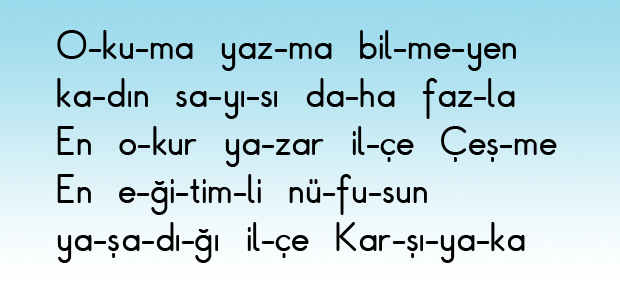 İzmir’de 6 yaş ve üzeri nüfusta okuma yazma bilmeyenlerin oranı yüzde 1,53 olurken, ilçeler sıralamasında yüzde 0,54 okuma yazma bilmeyen oranıyla Çeşme ‘en okur yazar ilçe’ oldu. Çeşme’yi Karşıyaka, Karaburun, Urla ve Güzelbahçe izledi. Yüzde 3,26 olan Türkiye ortalamasının üzerine yüzde 3,58 ile çıkan Kiraz İzmir’in okur yazar oranının en düşük olduğu ilçe oldu.