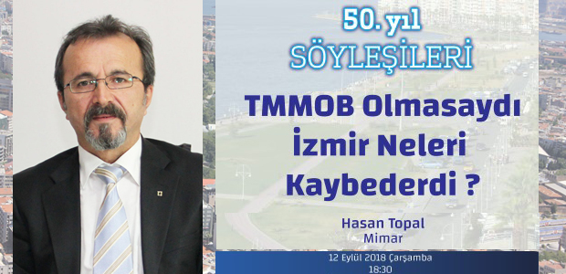 Türk Mühendis ve Mimar Odaları Birliği (TMMOB) Elektrik Mühendisleri Odası İzmir Şubesi, 50. Yıl Söyleşileri kapsamında “TMMOB Olmasaydı İzmir Neleri Kaybederdi?“ başlıklı bir söyleşi düzenliyor. Mimarlar Odası eski Genel Sekreteri, Mimarlar Odası İzmir Şubesi Geçen Dönem Başkanı Hasan Topal’ın konuşmacı olduğu söyleşi,12 Eylül 2018 Çarşamba günü saat 18.30’da başlayacak. Söyleşi, İzmir Mimarlık Merkezi’nde düzenlenecek.