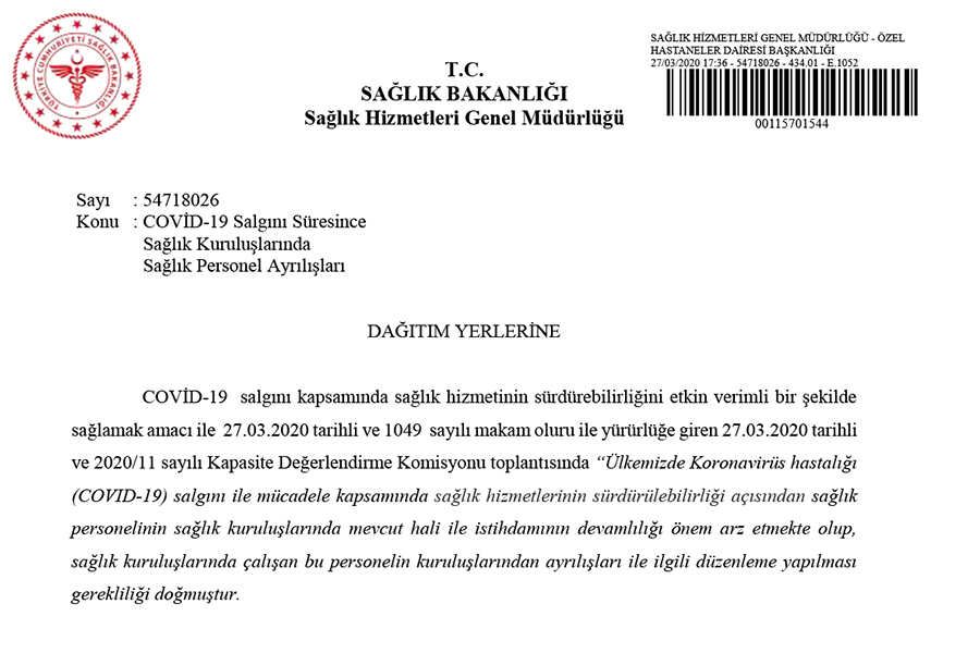 “Pandemi süreci kapsamında, bu kararın alınmasını müteakip üç ay boyunca, kamu ve özel sektöre ait tüm sağlık kurum ve kuruluşlarında görevli bulunan/çalışmakta olan hiçbir sağlık personelinin ikinci bir duyuruya kadar görevlerinden/işlerinden ayrılmasına izin verilmemesi kararlaştırılmıştır. Pandemi ile etkin mücadele edilebilmesi ve hizmetin aksamasına mahal verilmemesi amacıyla konuyla ilgili kuruluşlara bilgilendirme yapılması ve uygulanması hususunda bilgilerinizi ve gereğini arz/rica ederim.