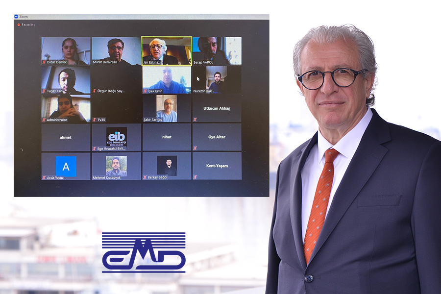 Ekonomi Muhabirleri Derneği (EMD) İzmir Şubesi tarafından düzenlenen ve Zoom uygulaması üzerinden gerçekleştirilen çevrimiçi basın toplantılarının ilk konuğu Ege İhracatçı Birlikleri (EİB) Koordinatör Başkanı Jak Eskinazi oldu. Koronavirüs (Covid-19) pandemisinin ülke ve bölge ihracatına etkilerini anlatan Eskinazi, çevrimiçi toplantıya katılan ekonomi muhabirlerinin gündeme ve sektörlere ilişkin sorularını yanıtladı.