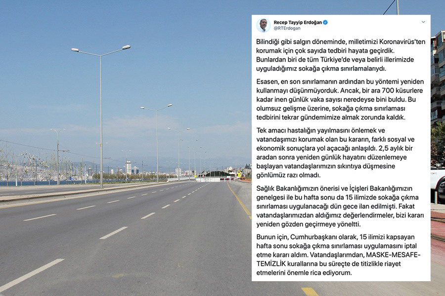 Bunun için, Cumhurbaşkanı olarak, 15 ilimizi kapsayan hafta sonu sokağa çıkma sınırlaması uygulamasını iptal etme kararı aldım. Vatandaşlarımdan, MASKE-MESAFE-TEMİZLİK kurallarına bu süreçte de titizlikle riayet etmelerini önemle rica ediyorum.