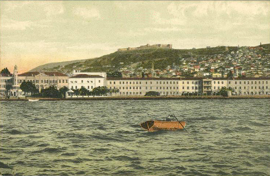Günümüzdeki Mithat Paşa Caddesi’nin yapımına başlandığı zaman Karataş’a doğru uzanan yolun başlangıç kısmında aldığı büyük kavis sözü geçen bloğun biçimi belirler. Caddenin günümüzde eski Güney Deniz Saha Komutanlığı binası önünde sağa doğru döner biçimli olması ilk yapılışta Sarıkışla’nın duvar gibi tam karşıda dikilmesindendir. Sözünü ettiğim ikinci blokta, bir yük katarının vagonları gibi sıralanmış, farklı yükseklikteki bir düzine civarında ve bazıları komutanlık tarafından kullanılan bazıları da gelir getirmesi için kiralanan binalar bulunmaktadır. Bu uzun bloğun ortalarına denk gelen bir noktasında, önündeki ana binanın denize doğru uzanan üçüncü kenarı vardır. Dolayısı ile bu biçimde bir yapı dizisi ile Sarıkışla iki büyük alana sahip olur. Bunlardan “U harfi”nin içinde kalan ve denize kıyısı bulunan alan genellikle törenler için, arkadaki uzun blokla ana yapı arasında alan daha büyük alan ise talim için kullanılır ve yapım sırasında deniz doldurularak geniş bir kullanım alanı kazanılır. Sonraları İzmir Cezaevi yapıları inşa edilecek olan günümüzdeki Konak Katlı Otoparkı’nın bulunduğu alan da başlangıçta Kışla arazisine dahildir. Binanın tüm dış cephesi sarı renkle boyandığı için adı İzmir tarihine Sarıkışla olarak geçer.
