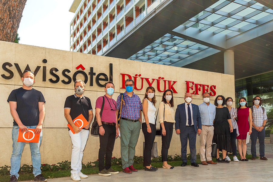 Swissotel Büyük Efes’in turuncu çember uygulamasının hijyen ve güvenlik kriterlerini karşılayıp karşılamadığı değerlendirme kurulunca değerlendirildi. İzmir İl Kültür Müdür Yardımcısı Kaan Erge, İzmir Büyükşehir Belediyesi Toplum Sağlığı Dairesi Başkanlığı’ndan Dr. Yusuf Demir, Yaşar Üniversitesi’nden Doç. Dr. Seda Genç, Ege Turistik İşletmeler ve Konaklamalar Birliği (ETİK) Başkan Yardımcısı Didem Ersoy, Türkiye Seyahat Acentaları Birliği (TÜRSAB) Ege Bölge Temsil Kurulu Başkanı Tolga Gencer, İzmir Turist Rehberleri Odası Yönetim Kurulu Üyesi Cenk Uysal’ın yer aldığı kurulun değerlendirmesi sonucunda Swissotel Büyük Efes’e turuncu çember sertifikası verilmesi kararlaştırıldı.