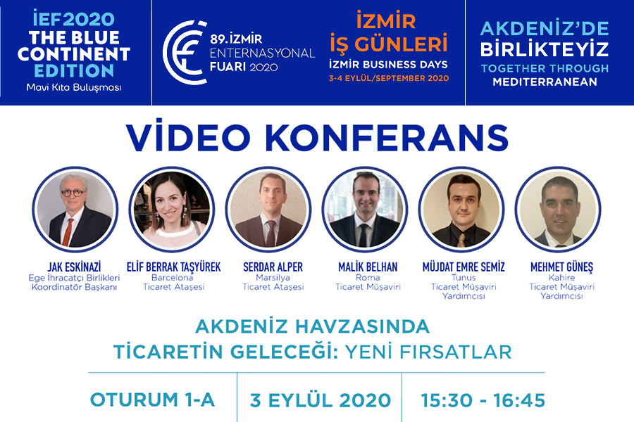 Ege İhracatçı Birlikleri, İzmir Enternasyonal Fuarı etkinlikleri kapsamında “Akdeniz Havzasında Ticaretin Geleceği: Yeni Fırsatlar” konulu video konferans düzenleyecek. Ege İhracatçı Birlikleri Koordinatör Başkanı Jak Eskinazi’nin yöneteceği video konferansa Tunus Büyükelçiliği Ticaret Müşaviri Emre Semiz, Barselona Başkonsolosluğu Ticaret Ataşesi Elif Berrak Taşyürek, Marsilya Başkonsolosluğu Ticaret Ataşesi Serdar Alper, Kahire Ticaret Müşavir Yardımcısı Mehmet Güneş, Roma Büyükelçiliği Ticaret Müşavir Yardımcısı Malik Belhan konuşmacı olarak katılacak. Internet üzerinden, Zoom uygulaması aracılığıyla düzenlenecek video konferans, 3 Eylül 2020 Perşembe günü 15.30 – 16.45 saatleri arasında gerçekleştirilecek.