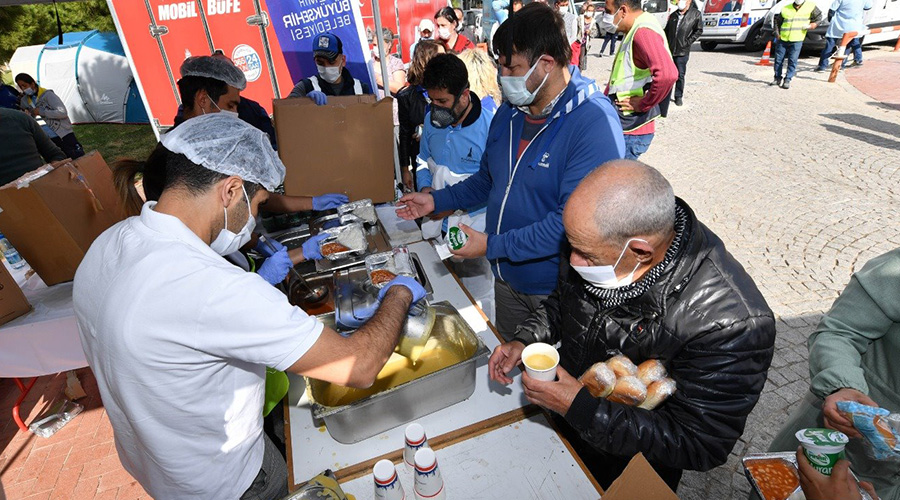 İzmir Büyükşehir Belediyesi depremzedelerin ve görevli ekiplerin yemek ihtiyacının yanı sıra, barınma, duş, seyyar tuvalet, psikolojik destek gibi konularda faaliyet gösteriyor. Depremzedelere ve sahada çalışan personele kahvaltılık malzeme, çorba, kumanya ve günde iki öğün sıcak yemek dağıtılıyor. Büyükşehir Belediyesi Aşevi’nden öğlen ve akşam olmak üzere günde toplam 26 bin kişilik yemek çıkıyor.
