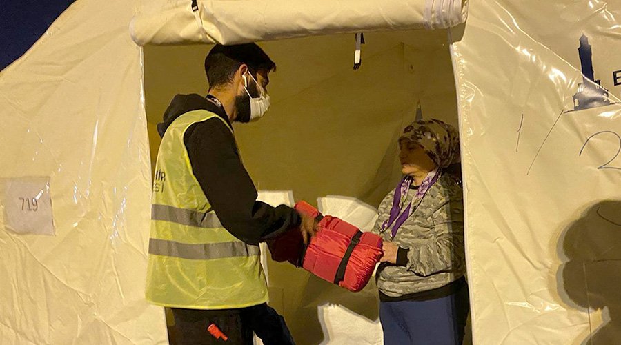 Depremin yaralarını sarmak için İzmir Büyükşehir Belediyesi tarafından kapsamı genişletilen “Biz Varız” kampanyası hız kesmeden sürüyor. Kampanya kapsamında “Halkın Bakkalı” ve “Biz İzmir” dijital platformları üzerinden satın alınan destek paketleri depremzedelere ulaştırılmaya başlandı. Aşık Veysel Rekreasyon Alanı’na getirilen 200 uyku tulumu ve Fuar İzmir’e getirilen 500 hijyen paketi günü ve geceyi toplanma alanlarında geçiren İzmirlilere ulaştırıldı.