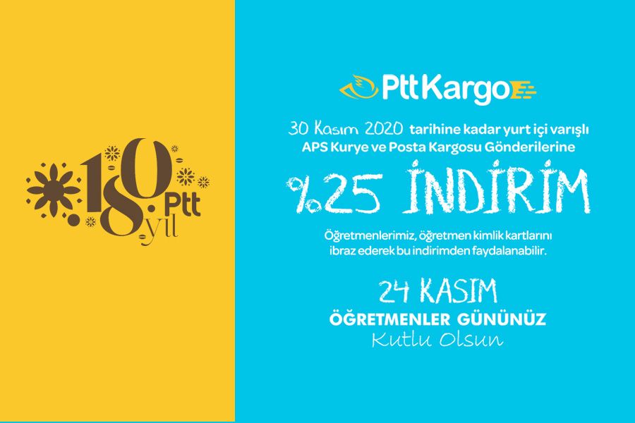 Türkiye’de 180 yıldır hizmet veren Posta ve Telgraf Teşkilatı Anonim Şirketi (PTT AŞ) 24 Kasım Öğretmenler Günü’nde, öğretmenlerin kargolarını yüzde 25 indirimli gönderecek. Kampanya kapsamında öğretmenler, 30 Kasım’a kadar yurtiçi varışlı APS Kurye ve posta kargolarında yüzde 25 indirimden yararlanabilecek. Kampanyadan yararlanabilmek için öğretmenlerin kimlik kartını göstermesi yeterli.