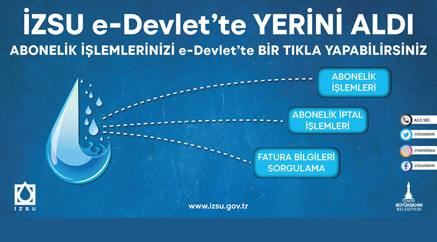 e-Devlet üzerinden online olarak su aboneliği işlemi yapabilmek için öncelikle e-Devlet portalına giriş yapılması gerekiyor. T.C kimlik numarası ve şifre ile sisteme giriş yapıldıktan sonra www.turkiye.gov.tr/izmir-su-ve-kanalizasyon-idaresi-genel-mudurlugu üzerinden işlem yapılabiliyor. Tüketiciler site üzerinden abonelik işlemleri, abonelik iptali ve fatura bilgilerini sorgulayabiliyor. İsim değişikliği veya iptal işlemi başvurusu yapılan abonelikler için borç bilgisi bulunmaması önem taşıyor.
