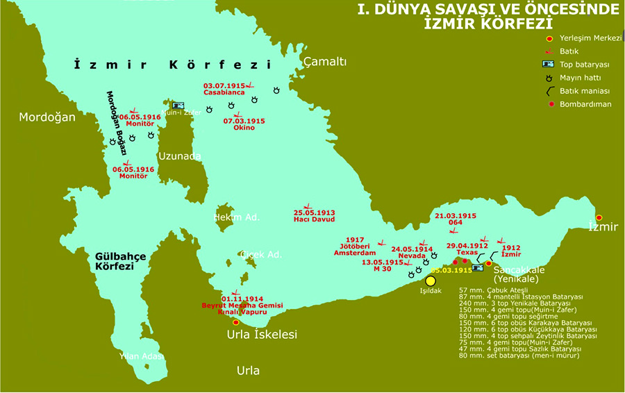 Birinci Dünya Savaşının çıkacağı belli olunca Osmanlı yönetimi İzmir Körfezi’nin girişini mayınlarla kapatır.