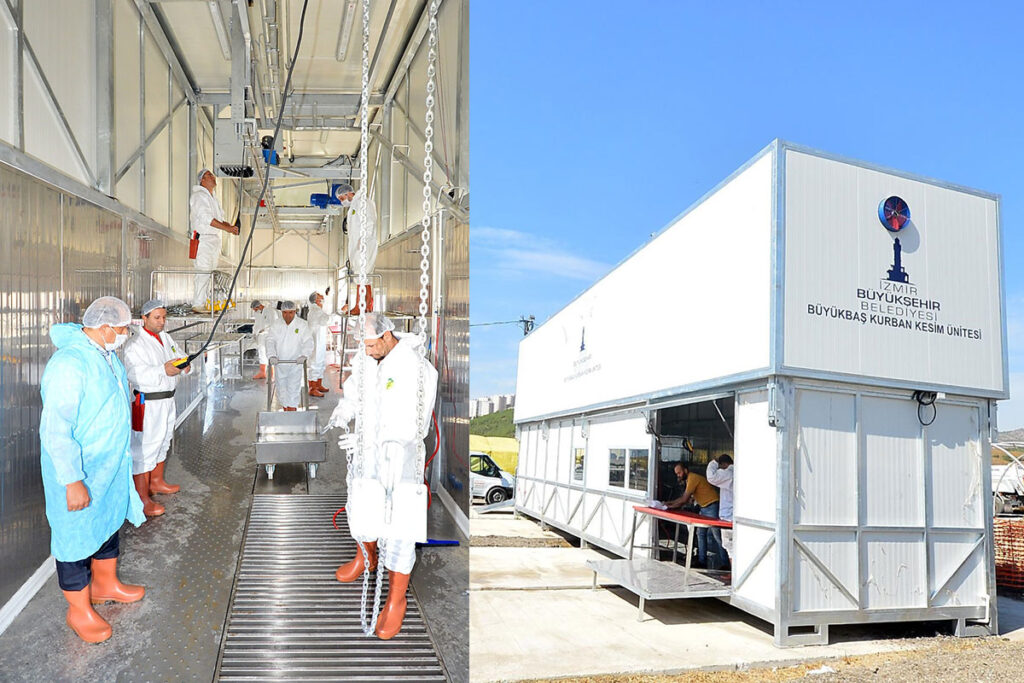 İzmir Büyükşehir Belediyesi’nin kesim yapacağı konteynerler 3 metre genişliğinde, 13 metre uzunluğunda ve 6 metre yüksekliğinde. İçinde vinç, monoray, su deposu, gövde ayırma testeresi ve kesim makası bulunuyor. Ayrıca büyükbaş kesimini monoray üzerinde mezbaha standartlarında yapılabilen ünitelerde günlük 100 büyükbaş hayvan kesimi yapılabilecek. Hijyen kurallarına uygun kesimler eğitimli kasaplar tarafından yapılacak. Kesim için konteynere giren hayvan en çok yedi parça halinde, gıda poşetleri içerisinde vatandaşlara teslim edilecek.