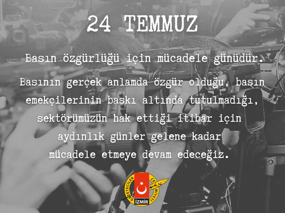 Türk basınında sansürün kaldırılmasının yıl dönümü olarak her yıl “Basın Bayramı” olarak kutlanan 24 Temmuz gününün artık “Basın Özgürlüğü İçin Mücadele Günü” olduğu anımsatıldı. İzmir Gazeteciler Cemiyeti’nden (İGC) yapılan açıklamada, “Sonuna kadar mücadelemizi devam ettireceğimizin sözünü veriyoruz” denildi.