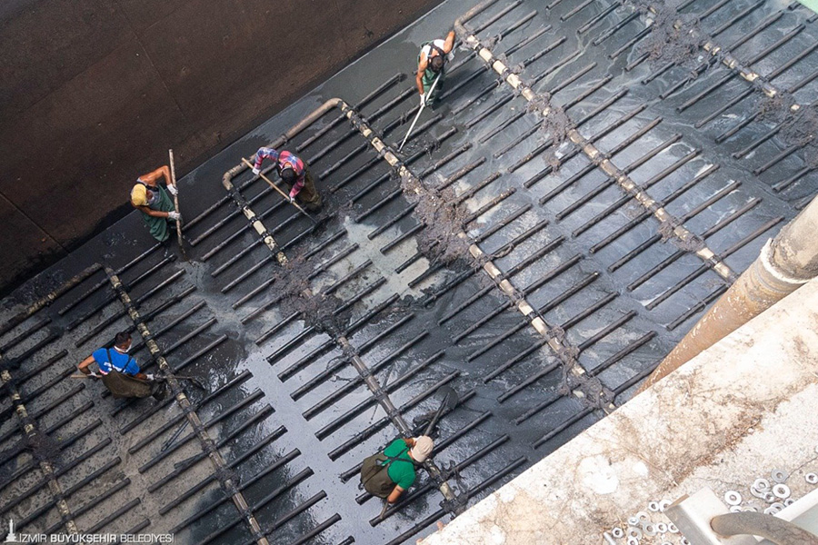 Yürütülen bakım ve temizlik çalışmaları kapsamında tesisin tüm ünitelerinde temizlik çalışması yapılıyor. Tesis bünyesinde bulunan koku kontrol sistemi kapsamında üzerleri kapatılmış olan ünite yüzeylerindeki kompozit kapaklar modüler olarak kaldırılarak havuz içi temizliği gerçekleştiriliyor. İkişer fazdan oluşan havuzların temizliği sırayla yapıldığından atıksu arıtma işlemi temizlik sırasında kesintisiz sürüyor.