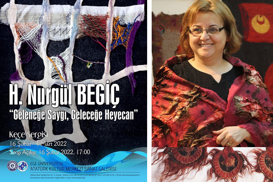 İzmir Demokrasi Üniversitesi Güzel Sanatlar Fakültesi Geleneksel Türk Sanatları Bölümü öğretim üyesi Doç. Dr. H. Nurgül Begiç “Geleneğe Saygı, Geleceğe Heyecan” temalı keçe sergisi açıyor. Ege Üniversitesi Atatürk Kültür Merkezi Sanat Galerisi’ndeki sergi 16 Şubat – 4 Mart 2022 tarihleri arasında izlenebilecek.