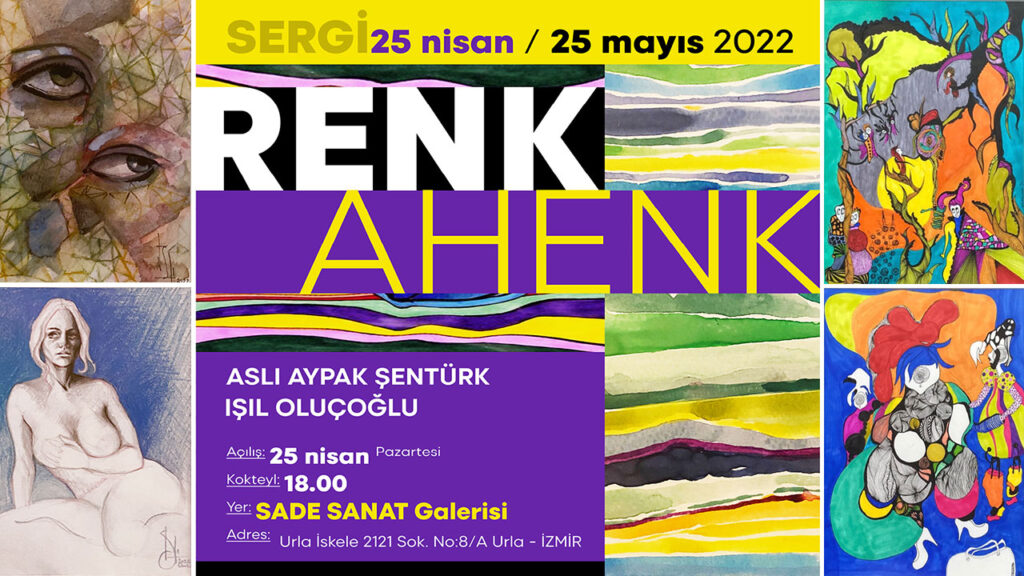 İzmirli sanatçılar grafik tasarımcı, ressam Aslı Aypak Şentürk ile seramik sanatçısı, ressam Işıl Oluçoğlu, renklerini Urla Sade Sanat Galerisi’nde “Renk Ahenk” adlı ortak sergide bir araya getirecek. 25 Nisan 2022 Pazartesi günü saat 18.00’de açılacak sergi 25 Mayıs 2022 Çarşamba gününe kadar ziyaret edilebilecek.