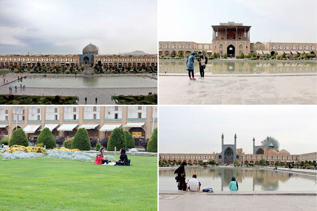 Şehirde yüksek binalar olmasına rağmen, meydanın içerisinden dışarıdaki binalar gözükmüyor. Dikdörtgen şeklindeki meydanın dört bir yanını çeviren kapalı çarşıda kilimden ipek halıya, gümüşten minyatüre İran’a her türlü geleneksel el sanatları ürünleri bulunuyor. Yine meydanın ortasında geniş bir avlu ve avlunun ortasında büyük bir havuz yer alıyor. Meydan çevresinde tur atmak isteyenler için ise faytonlar bulunuyor.