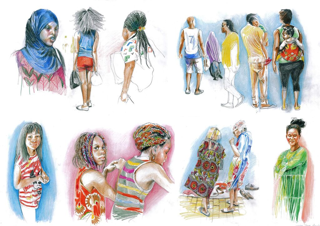 Göç yolculuğuna çıkmış insanlar 6 Ekim 2022 Bedriye Gülay Beşikçi Basmane göç yolculuğuna çıkmış insanlara ev sahipliği yapıyor. Son yıllarda Afrikalı göçmenlerin sayısında artış var. Afrikalıları çizmeye devam ediyorum. İyi izlemeler… Related Images: