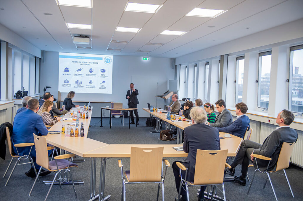 Bremen Uygulamalı Bilimler Üniversitesi Akademik İşlerden Sorumlu Başkan Yardımcısı Prof. Dr. Thomas Pawlik’in sunumuyla başlayan toplantıda, İMEAK Deniz Ticaret Odası İzmir Şubesi Yönetim Kurulu Başkanı Yusuf Öztürk, İzmir’deki limanlar ve denizyolu taşımacılığı ile ilgili bir sunum yaptı. Sunumun ardından soruları yanıtlayan Öztürk, Türkiye’de limanlarda elleçlenen yükün yüzde 15’inin İzmir ve Aliağa limanlarında gerçekleştiğini söyledi. Ege Bölgesi’nde artan sanayi yatırımlarının ve yükselen ihracatın, bölge limanlarının potansiyeline olumlu şekilde yansıdığını anlattı.