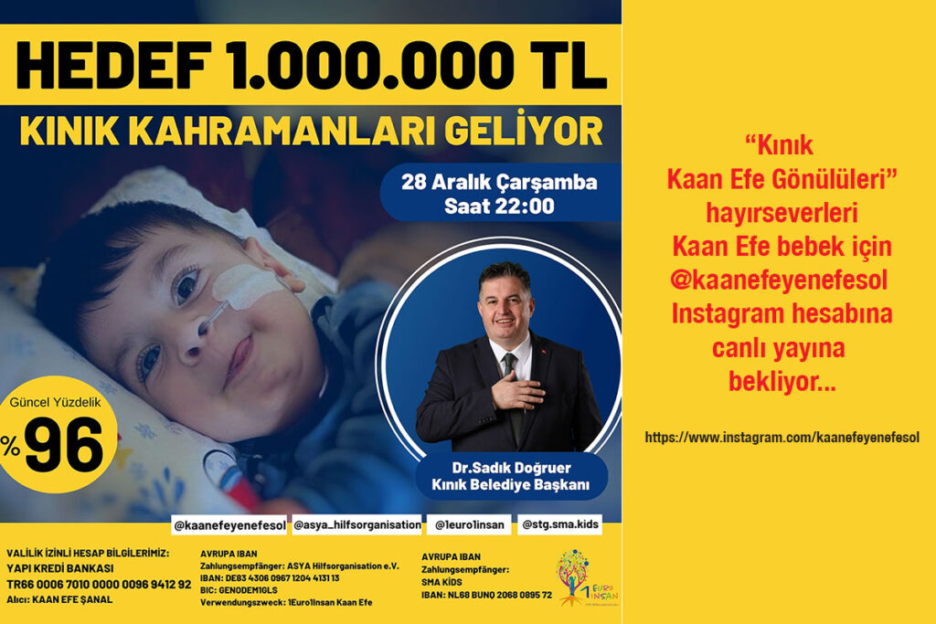 Kınıklı Kaan Efe Gönülüleri, tüm hayırseverleri 8 Aralık 2022 Çarşamba günü saat 22.00’de Instagram’da Kaan Efe bebek için gerçekleştirilecek canlı yayına davet etti.