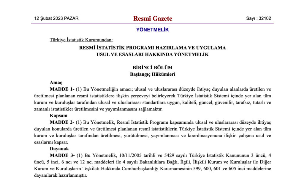Türkiye İstatistik Kurumu’nca “Resmi İstatistik Programı Hazırlama ve Uygulama Usul ve Esasları Hakkında Yönetmelik” hazırlandı. 12 Şubat 2023 Pazar tarihli 32102 sayılı Resmi Gazete’de yayımlanan yönetmeliğin amacı, “Ulusal ve uluslararası düzeyde ihtiyaç duyulan alanlarda üretilen ve üretilmesi planlanan resmi istatistiklere ilişkin çerçeveyi belirleyerek Türkiye İstatistik Sistemi içinde yer alan tüm kurum ve kuruluşlar tarafından ulusal ve uluslararası standartlara uygun, kaliteli, güncel, güvenilir, tarafsız, tutarlı ve zamanlı istatistikler üretilmesini ve yayımlanmasını sağlamak” diye tanımlandı.